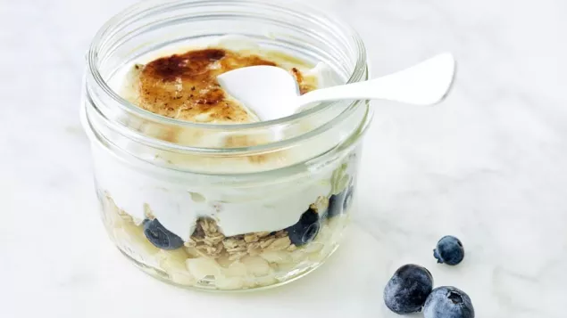4. Serveer de yoghurt voordat de suiker weer zacht wordt.